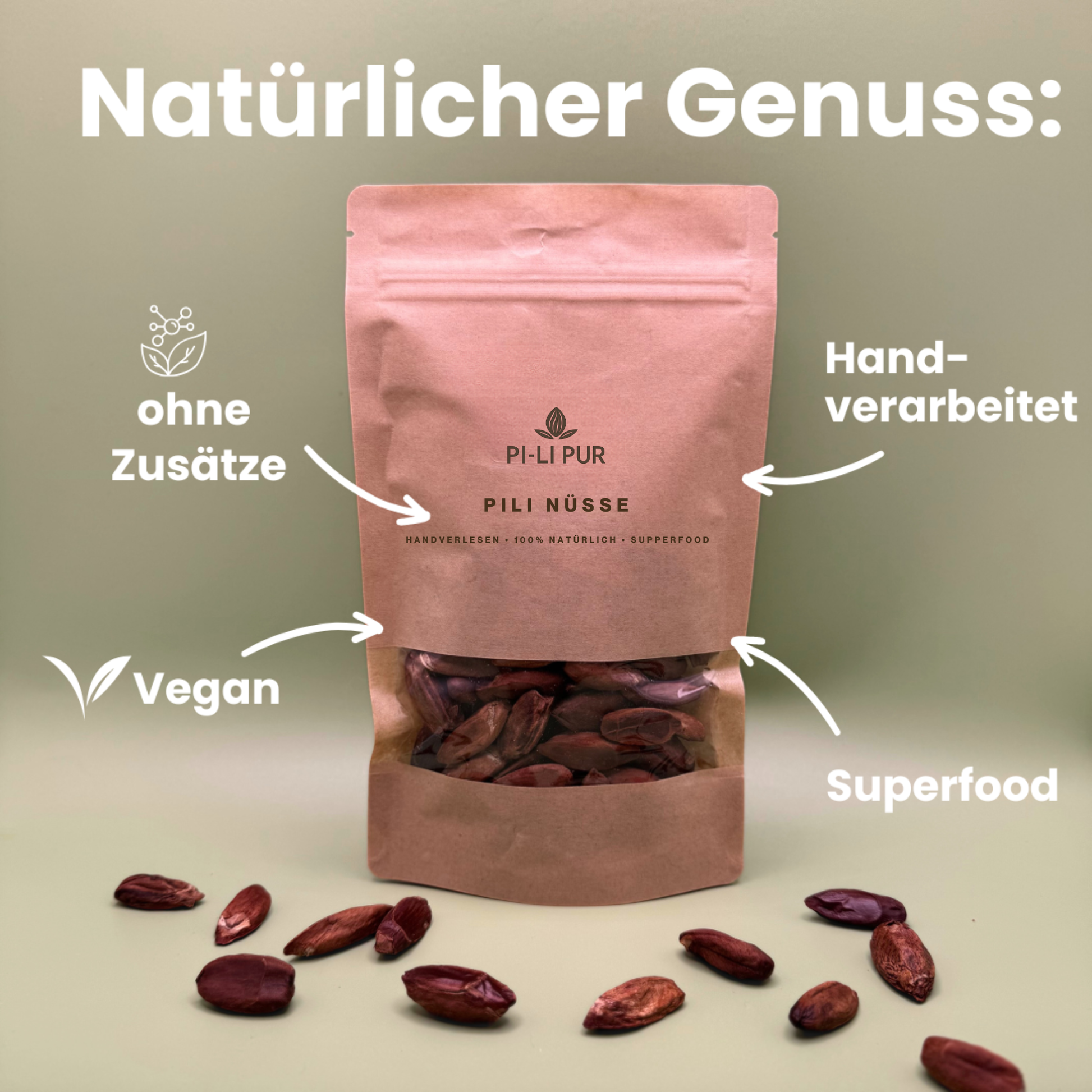 Pili-Nüsse sind wahre Kraftpakete der Natur! Mit der härtesten Schale aller Nüsse können sie nur von Hand geöffnet werden. Ihr cremig-nussiger Geschmack macht sie zu einem einzigartigen Superfood – 100 % natürlich, nährstoffreich und nachhaltig geerntet